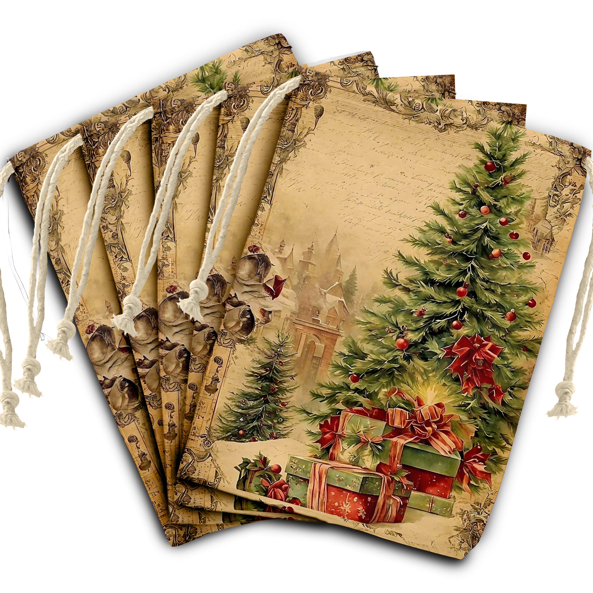 These charming bags feature a convenient drawstring closure, making it effortless to secure your presents while adding a delightful touch of Christmas cheer.